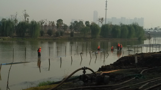 三环线西段改造工程作业人员在湖中进行沙沉坝围堰施工(图:周萌)