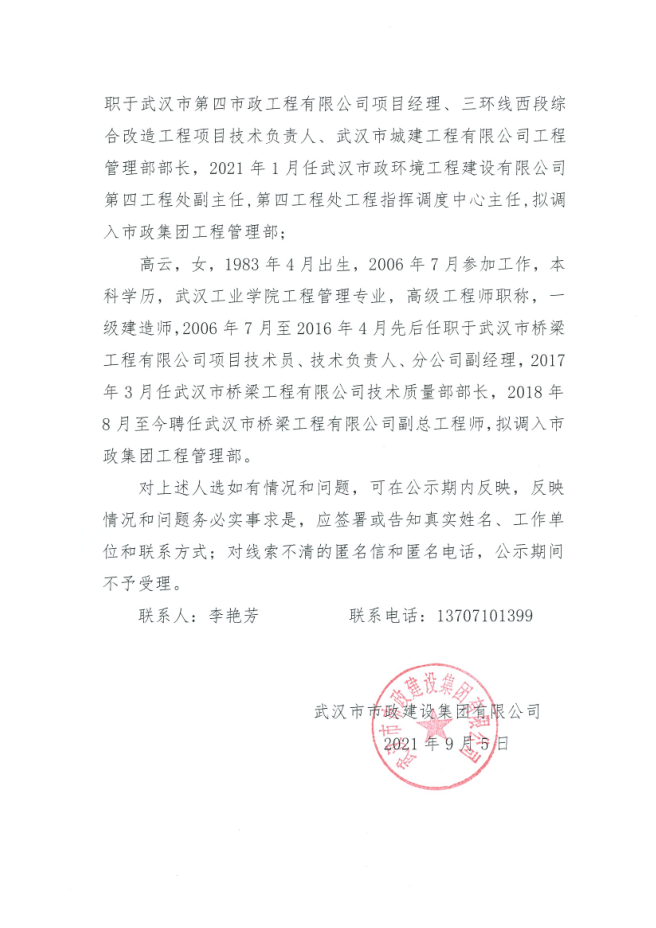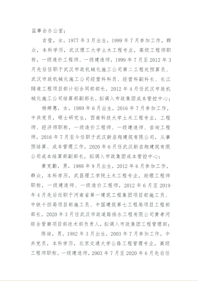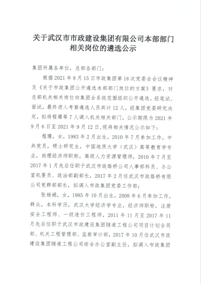 关于武汉市市政建设集团有限公司本部部门相关岗位的遴选公示
